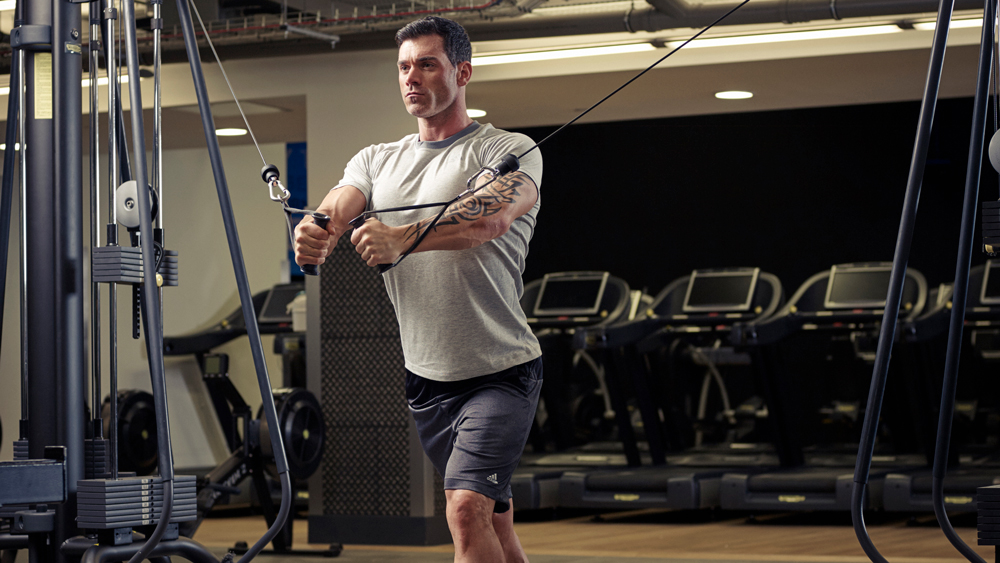How Stand in the middle of a cable machine holding a D-handle in each hand. Keeping a slight bend in your elbows and your chest up, bring your hands down in an arc to meet in front of your chest. Reverse the movement back to the start.