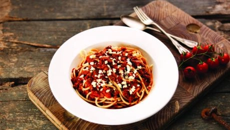 - Add the Worcestershire sauce to the bolognese and serve on the spaghetti, with Lancashire cheese sprinkled on top.