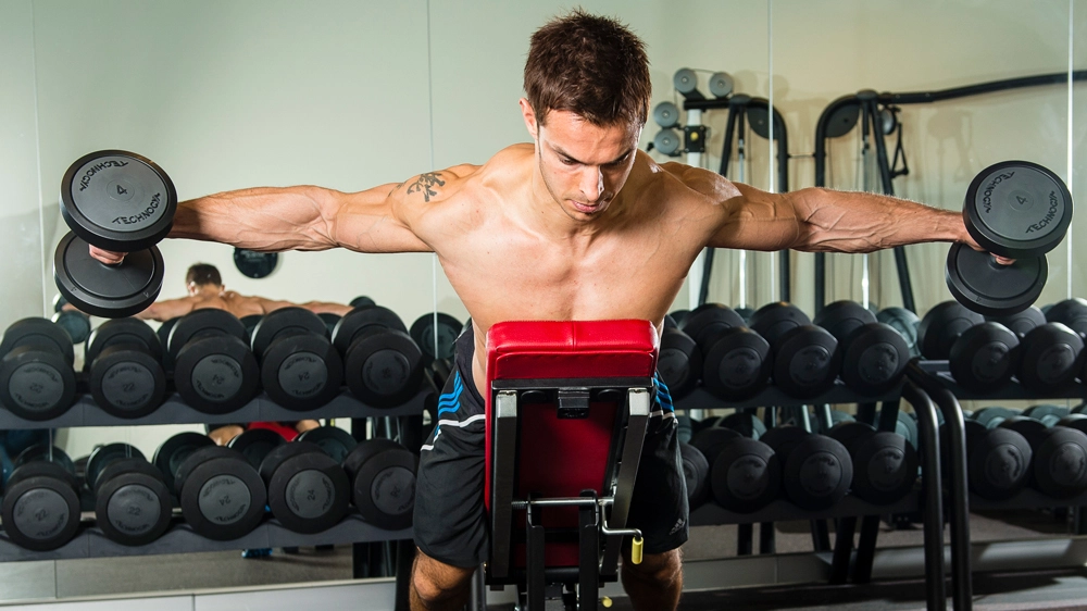 Sit on an upright bench, holding a light dumbbell in each hand by your sides with a slight bend in your elbows. Keeping your chest up and core braced, raise the weights out to shoulder height, leading with your elbows, then return slowly to the start.
